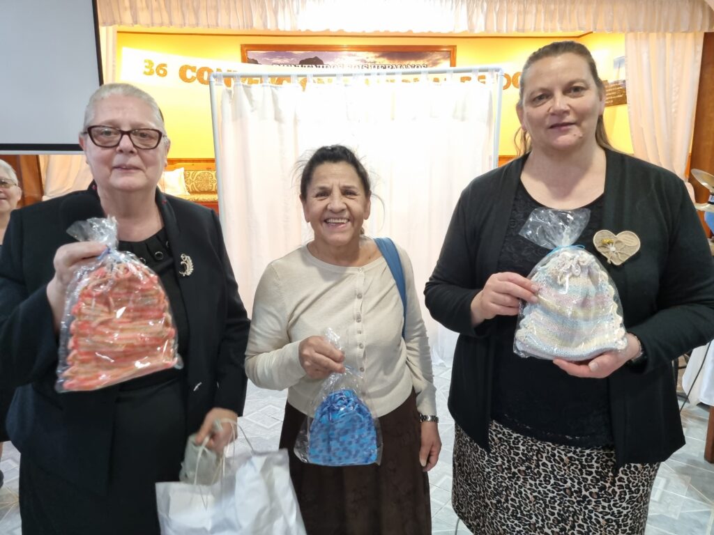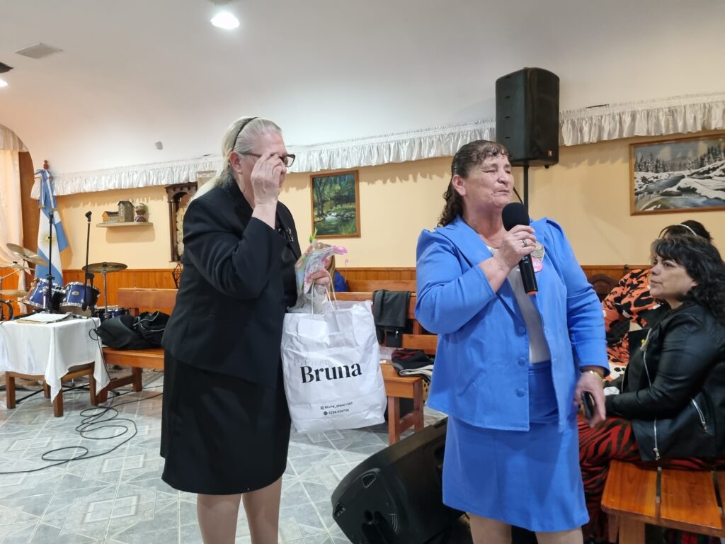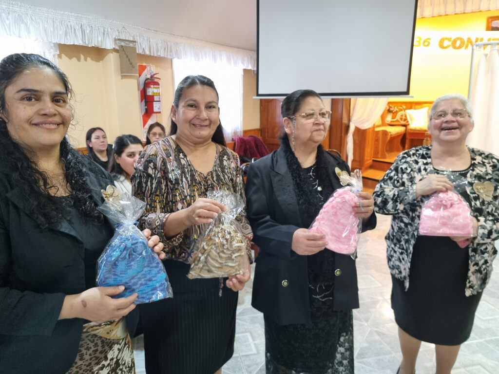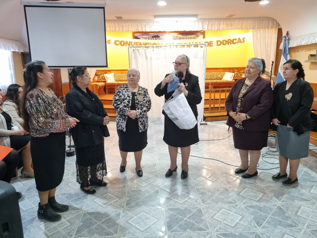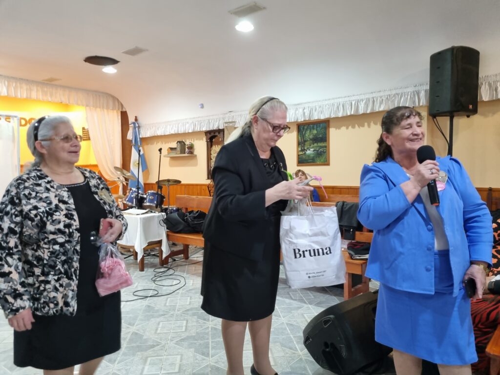 Luego se repartieron distintos regalos preparados tanto por la iglesia sede, como por diversas hermanas como Sandra Monserrat, de la iglesia de Centenario, que realizó unos monederos para la ofrenda de las reuniones de las hermanas Dorcas y la hermana Marita de la iglesia de Neuquén, que preparó regalos para todas las presentes, «las obras de amor las pagará vuestro Dios».